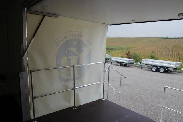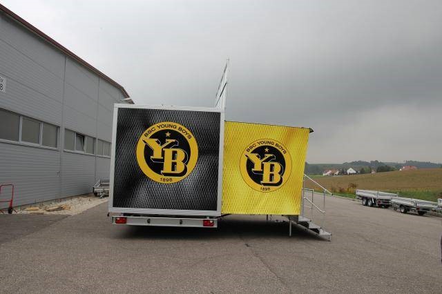Auf Wunsch kann der Anhänger komplett individualisiert werden. Eine seitliche Trittstufe ermöglicht es Besuchern, bequem auf den Anhänger einzusteigen und die ausgestellten Produkte oder Services direkt vor Ort zu erleben. Zusätzlich kann eine Verkaufsklappe integriert werden, die beim Öffnen seitliche Banner als Windschutz entfaltet – so wird der Verkaufs- oder Präsentationsbereich vor Wind und Wetter geschützt und bietet gleichzeitig eine weitere Werbefläche.