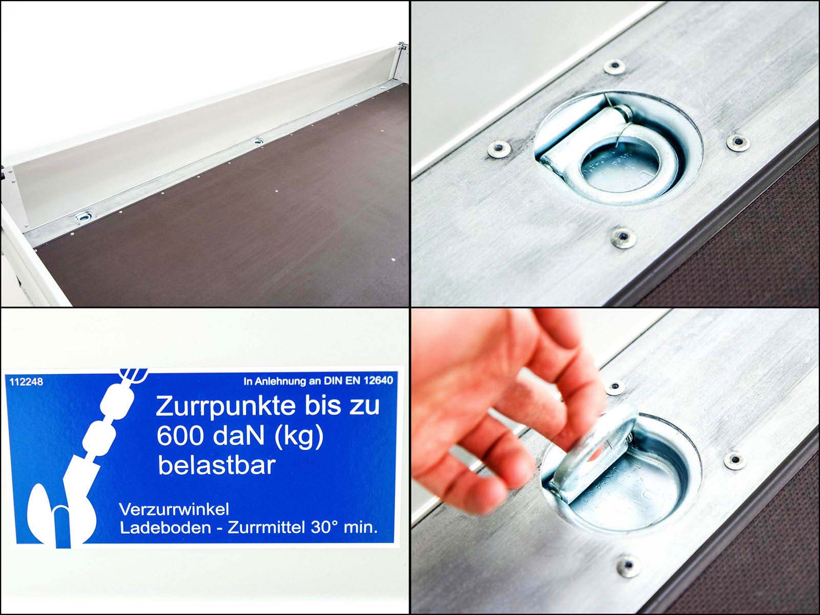 - 6 Zurrmulden mit jeweils bis zu 600 daN (kg) belastbar und DEKRA zertifiziert