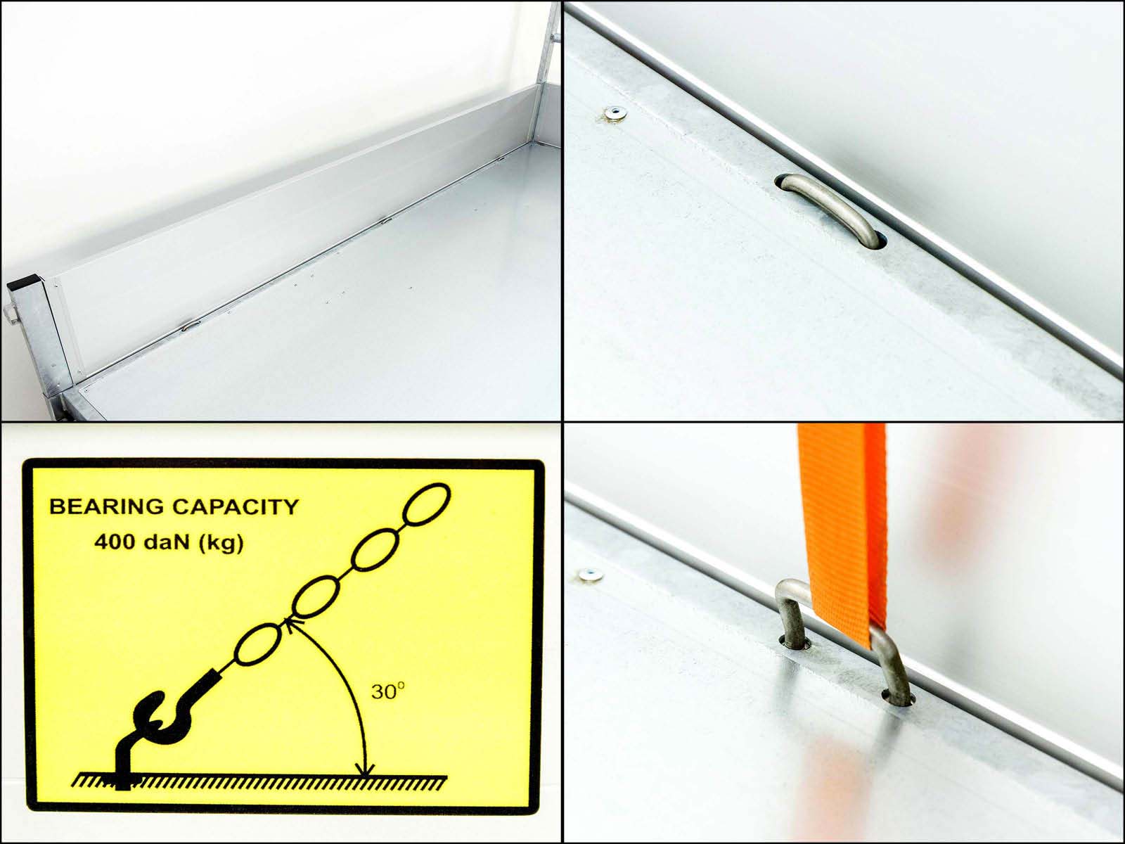 | Verzurrösen auf Ladeboden: | 6 Zurrbügel im Bodenrahmenprofil |