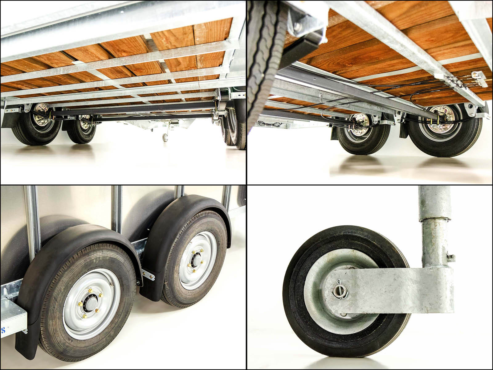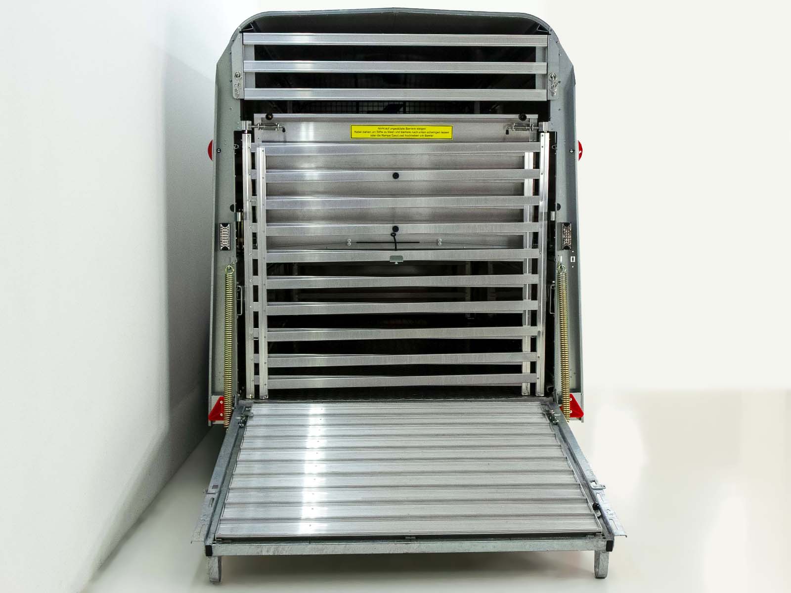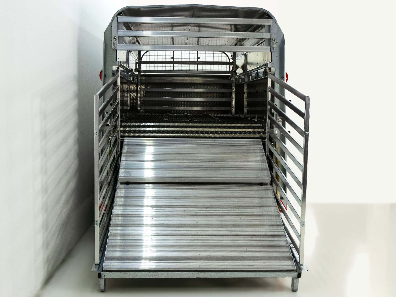 Nach der Beladung können die seitlichen Trenntüren bequem nach innen geklappt werden, um das Entweichen des Viehs nach hinten zu vermeiden. Einfach kann der Viehanhänger an ein Fahrzeug gekoppelt und die Rücklichter über ein Kabel mit Strom versorgt werden. Mit einem zulässigen Gesamtgewicht von bis zu 3,5t lässt sich der Transport für Landwirte, Pferdebesitzer und Veterinäre insgesamt beladen. An heißen Sommertagen reflektiert das weiße Dach zusätzlich die Hitze und sorgt für ein angenehmes Raumklima während der Fahrt. Abgerundet wird der Tiertransporter durch ein solides Fahrgestell mit Blattfedern und einem Rahmen aus verzinktem Stahl.